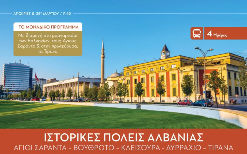 Highlights: Το πρόγραμμα περιλαμβάνει διαμονή τόσο στην παραθαλάσσια “Ριβιέρα” (Αγ. Σαράντα) όσο και στην πρωτεύουσα (Τίρανα).