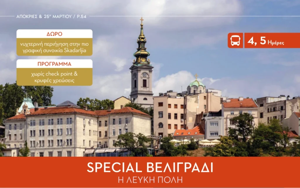 2η Ημέρα: Γύρος πόλεως με επίσκεψη στο Φρούριο Καλεμέγκνταν, τον Πύργο Nebosja (τόπος θανάτου του Ρήγα Φερραίου) και τον επιβλητικό Ναό του Αγίου Σάββα. Το βράδυ, βόλτα στην μποέμ συνοικία Skadarljia (τα “Λαδάδικα” του Βελιγραδίου).